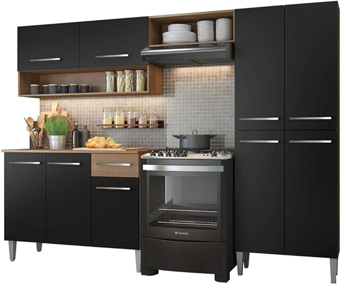 A combinação da cor Rustic (madeira clara) com o Preto não é apenas uma escolha estética; é uma tendência que esconde melhor marcas de uso e traz uma sofisticação de "móvel planejado" para cozinhas compactas.